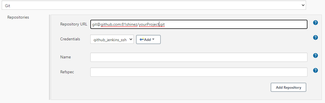 SCM을 Git으로 선택 후, GitHub의 Repository를 선택해준다.