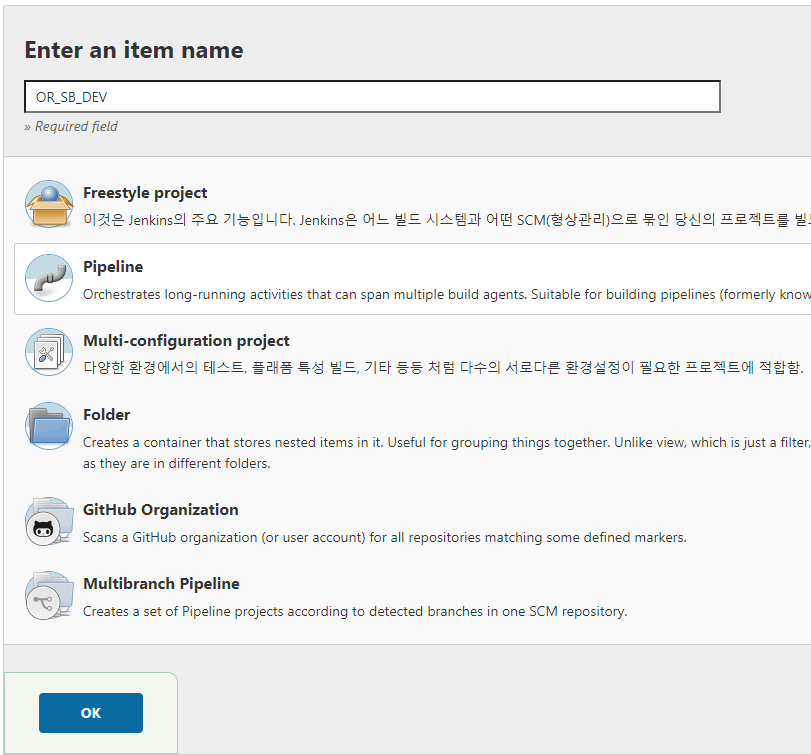 'Pipeline', 배관 아이템을 선택한다. 아이템 이름은 필수값이다.